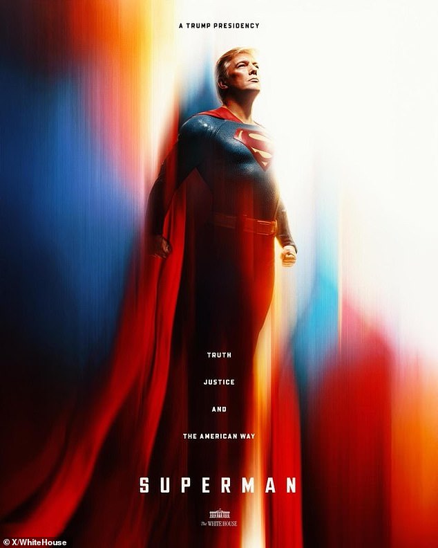 The shocking new meme was shared by the White House yesterday, showing the country’s head of state’s face plastered onto the chiseled body of DC’s Man of Steel.