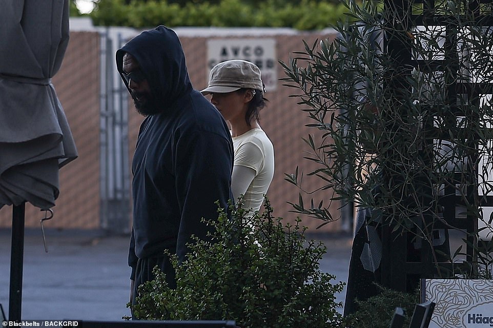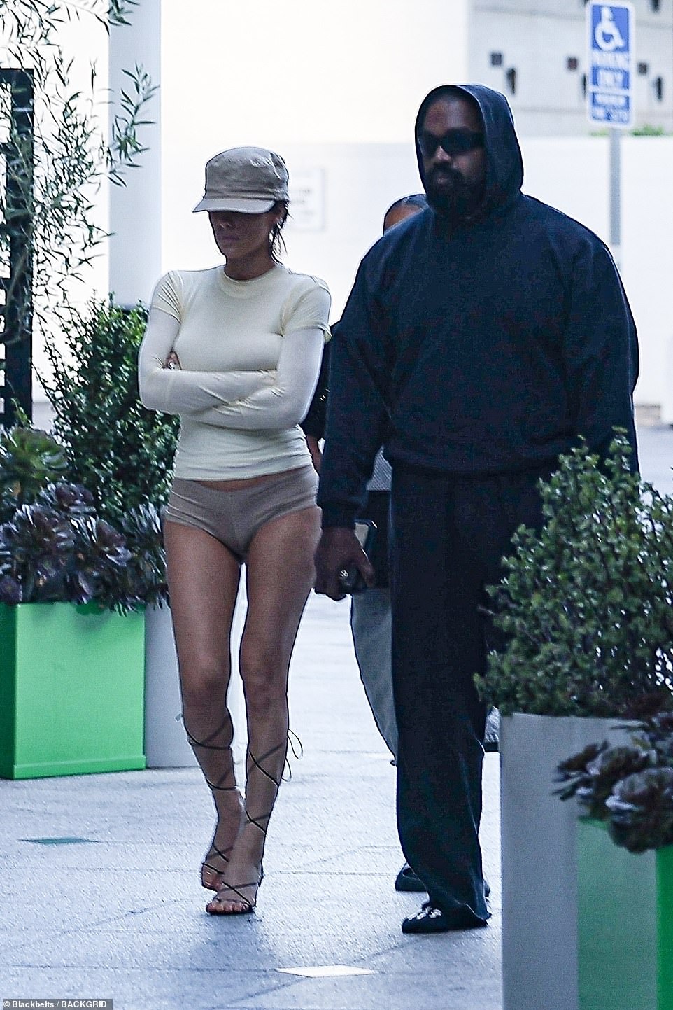She then accessorized the pantless look with her beige-toned baseball cap and her dark brown hair. Meanwhile, her husband opted to fly under the radar with a black hoodie that was pulled across his head. This look was complete with sunglasses and matching sweatpants.
