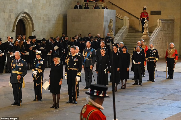 Prince William and Prince Harry stood together with their wives Kate Middleton and Meghan Markle to honor the beloved Queen for her lying in state service.