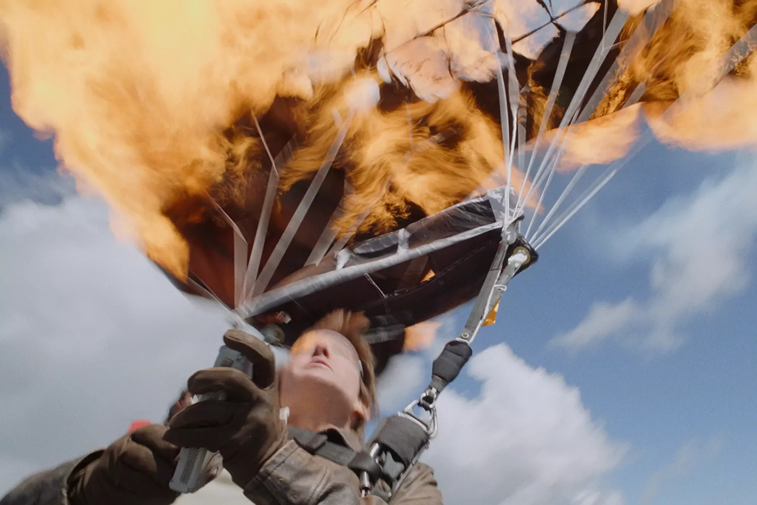 He then deploys a parachute only to have that burst into flames and disintegrate. It forces him to deploy the backup parachute as he falls to the ground. In some of the takes, Cruise and the director outfitted the star with a 50-pound camera rig attached to his body and which captured a close-up of Ethan’s fall.