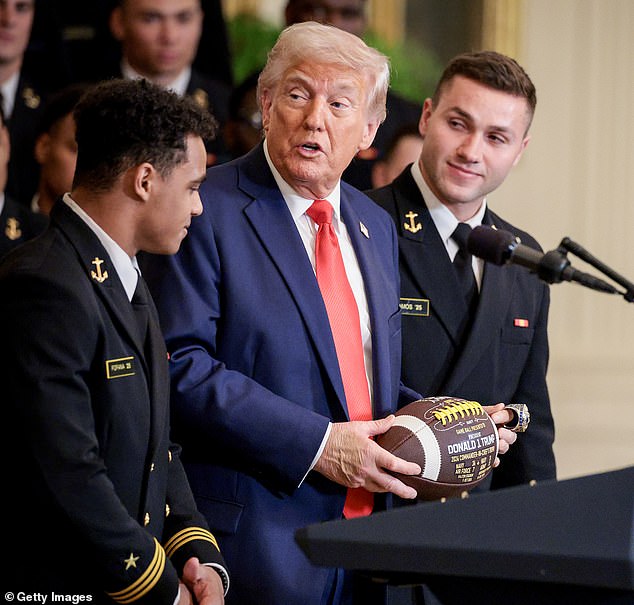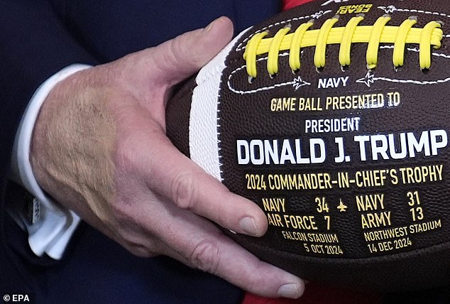The sprawling bruise was seen as Trump presented the Commander-in-Chief trophy to the Navy Midshipmen football team on Tuesday.