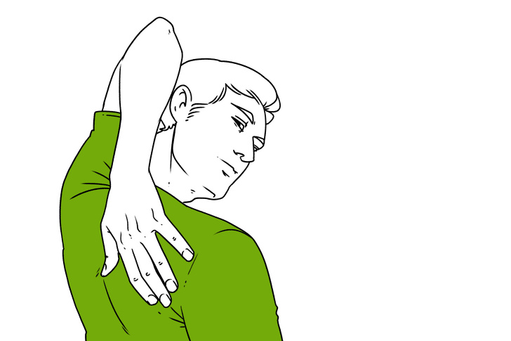Touch the opposite shoulder blade with your palm. Your head may push forward a little bit.