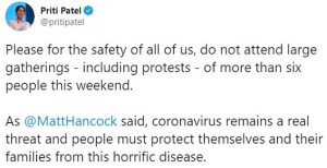 Pritti Patel is telling the Black Lives Matter protesters to go back to their houses instead of carrying out demonstrations this weekend.