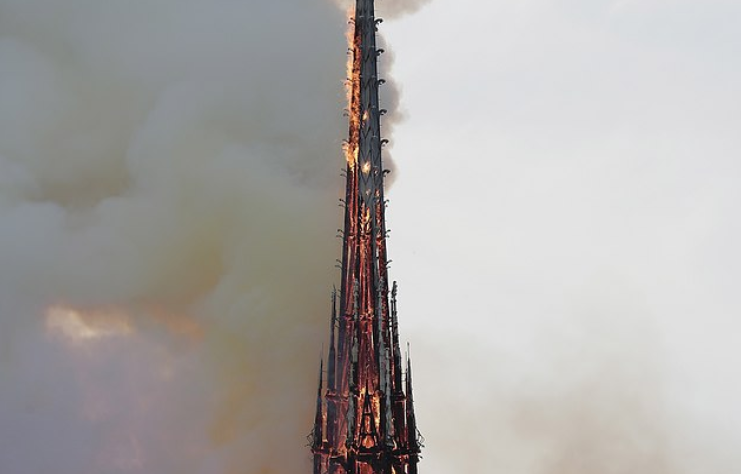 The cathedral’s main spire, made of over 750 tonnes of oak lined with lead, crashed through the timber-framed skeleton after collapsing due to flames.