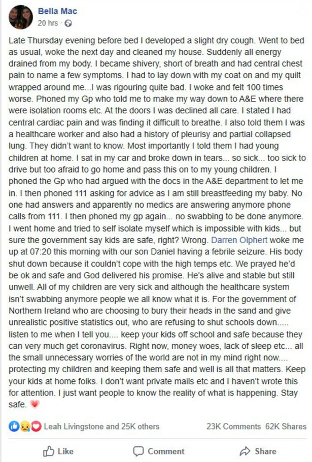Clare said: “I went home and tried to self isolate myself which is impossible with kids but sure the government says kids are safe, right? Wrong.”