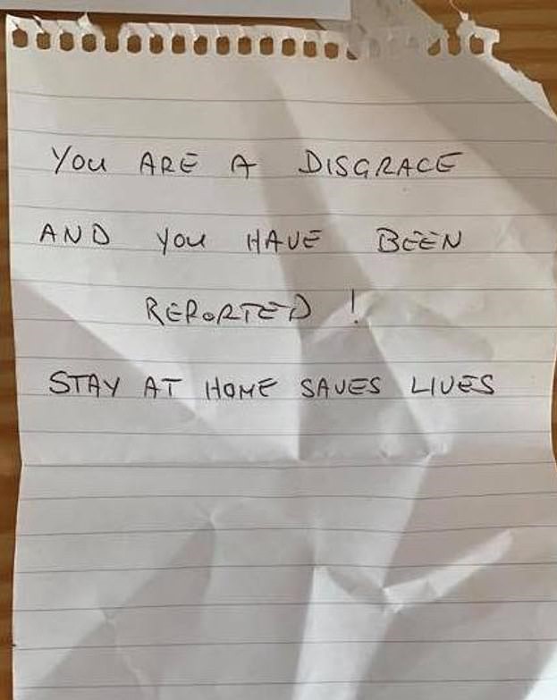 “You are a disgrace and you have been reported! Stay at Home Saves Lives,” the note read.