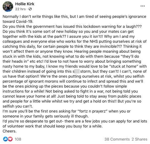Hollie Kirk, from Devon, shared a post on Facebook blasting the people who are spreading the virus by going out and not practicing social distancing amid coronavirus crisis.