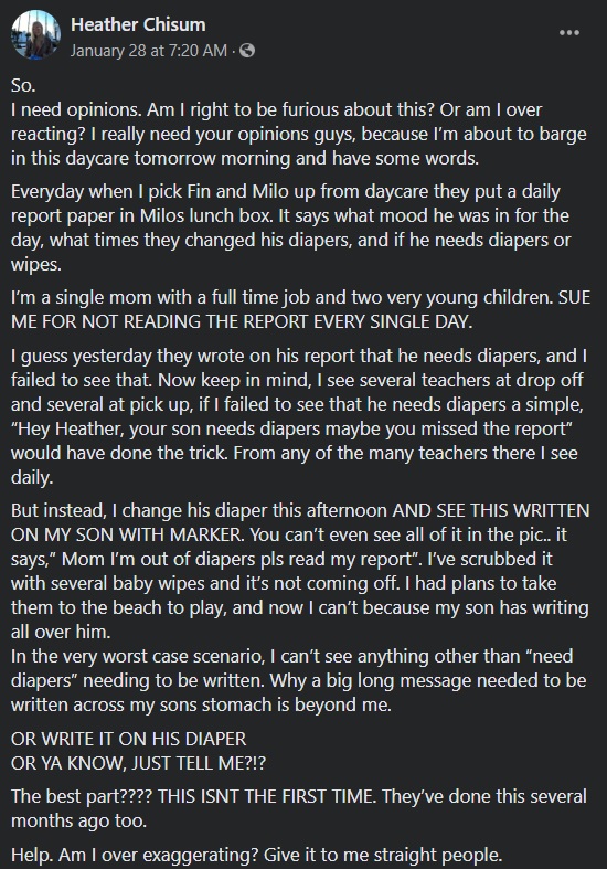 As 23-year-old single-mother-of-two Heather Chisum explained, her toddler’s teacher wrote on the child using a waterproof marker after she forgot to read her report due to being extremely busy.