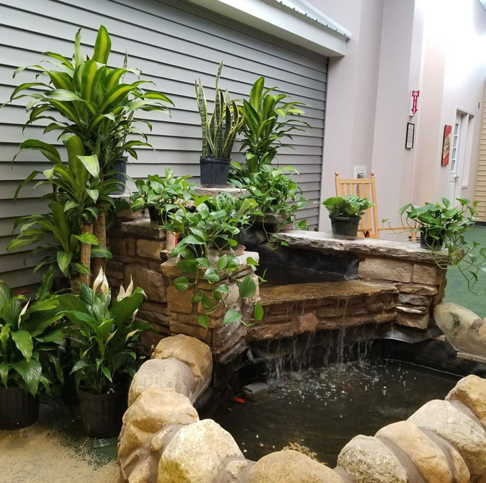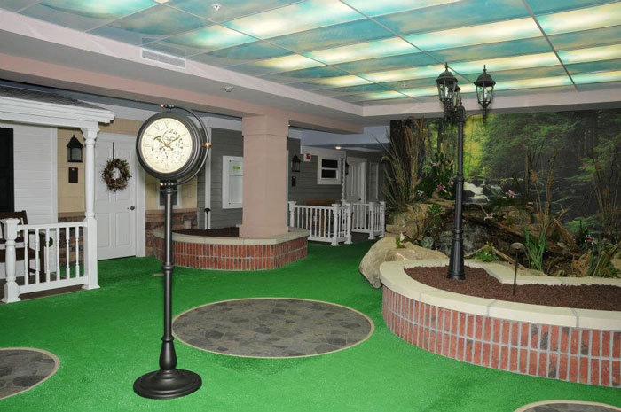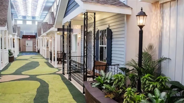The facility highlights living units that look like houses, equipped with porches and everything. There’s carpeting give the feel of grass, ceiling lighting that mimics a partly-cloudy sky, and other decorative elements like street lights and garden-like flora.