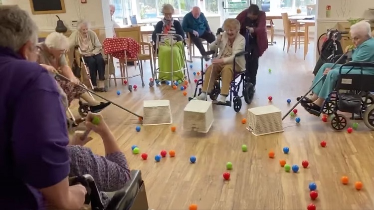 The started when someone shouted “Go!” off-camera. With workers pushing the residents’ wheelchairs, each player tried to use their basket to grab as many balls as possible, generating laughter from everyone present.