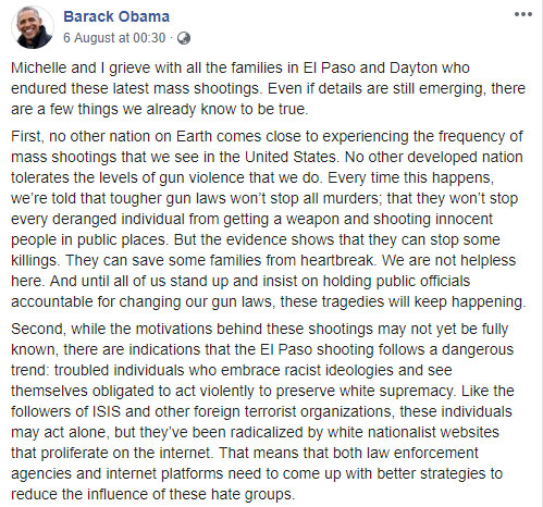 “Every time this happens, we’re told that tougher gun laws won’t stop all murders, that they won’t stop every deranged individual from getting a weapon and shooting innocent people in public places,” Obama wrote. “But the evidence shows that they can stop some killings. They can save some families from heartbreak.”