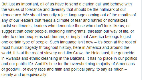 “We should soundly reject language coming out of the mouths of any of our leaders that feeds a climate of fear and hatred or normalizes racist sentiments; leaders who demonize those who don’t look like us, or suggest that other people, including immigrants, threaten our way of life, or refer to other people as sub-human, or imply that America belongs to just one certain type of people,” Obama said in comments posted on social media.
