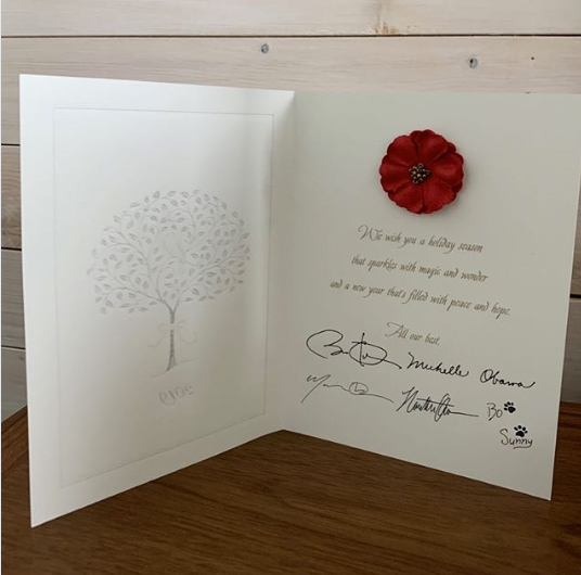 The Christmas card was signed by former President Barack Obama, Michelle, their children Sasha and Malia, and also their furry family members Sunny and Bo. It also has cute paws drawn next to the pooches’ signatures.