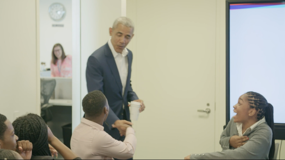 Former President Barack Obama surprised a group of recent high school graduates by visiting in the Chicago office.