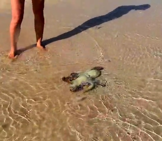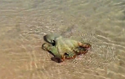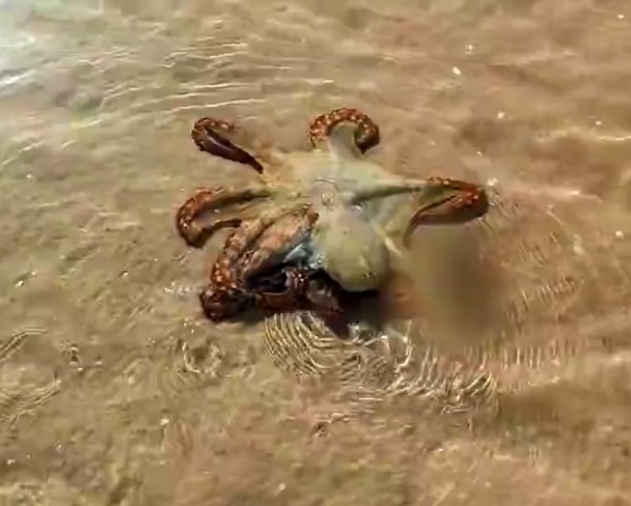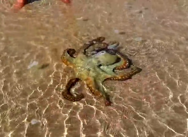 “While walking along a lovely beach, we saw a stranded octopus in the sand. We were not sure if he was already dead. So we pushed him back into the water. He needed some minutes to recover, then he swam away,” the woman wrote in a YouTube video.