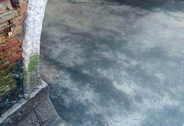 Sediment settle at the bottom as the waters are no longer stirred by gondolas, boats, vaporetti and taxis that usually cross it.