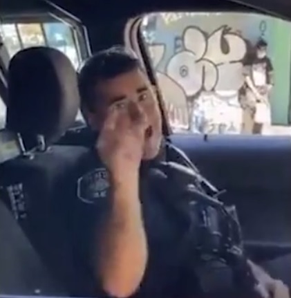 After explaining his reasons to the protester, the cop briefly sped up his car before coming to a stop and leaning out of the door to address another protester.