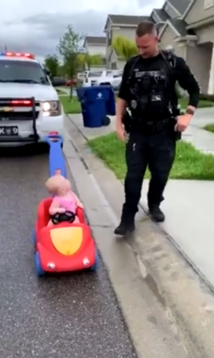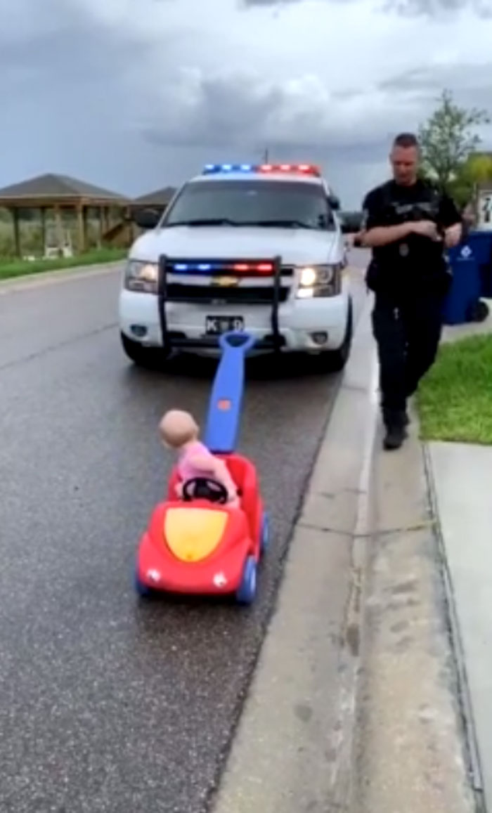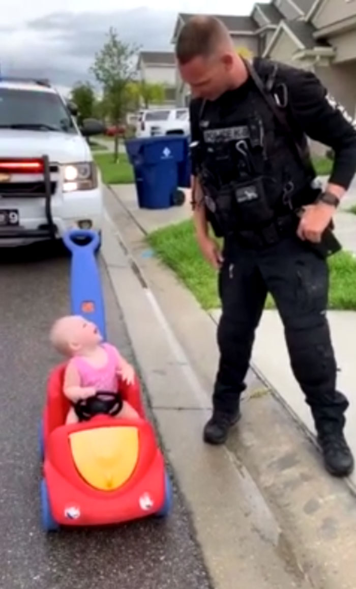 She looks at the officer in confusion for a few seconds and then giggles. The officer warns her that it is not funny but the adorable toddler still giggles.