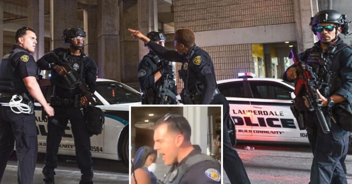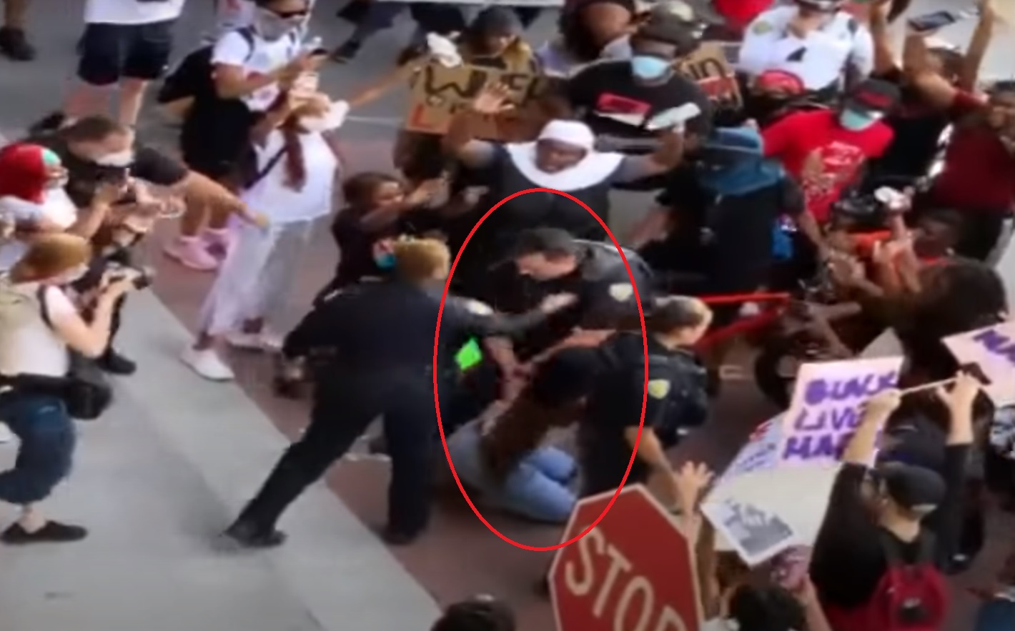 In Fort Lauderdale, a relatively peaceful protest had been underway when things took a turn for the worse as a male police officer pushed an unsuspecting kneeling woman to the ground as he passed by.