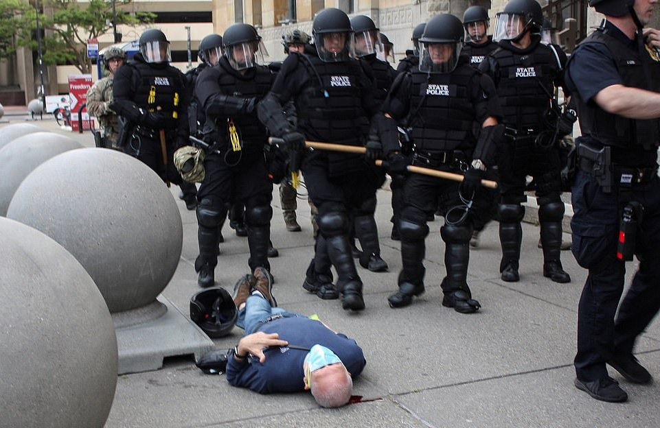 As seen in the footage taken at the time of the incident, Gugino appeared to have peacefully approached the marching police force when the cops in question shoved him away causing him to fall and crack his head.
