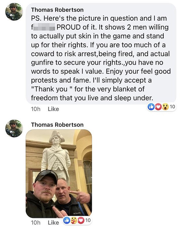 “CNN and the Left are just mad because we actually attacked the government who is the problem and not some random small business. The right IN ONE DAY took the f***ing U.S. Capitol. Keep poking us,” Robertson allegedly wrote in one of his Facebook posts.