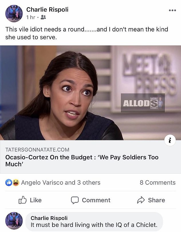 Officer Charlie Rispoli from the Gretna Police Department in Louisiana shared a fake story about Ocasio-Cortez on his Facebook page and wrote: “This vile idiot needs a round and I don’t mean the kind she used to serve.”