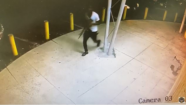 The surveillance footage shows the suspect in a white T-shirt, sneakers and black pants carrying an AR-15 assault rifle in the area of Pryor Road and University Avenue.