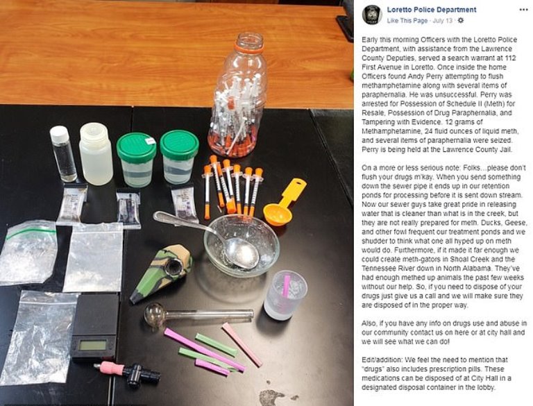 Police officers in Tennessee are ordering people not to flush meth down the toilet as it could cause ‘meth-gators.