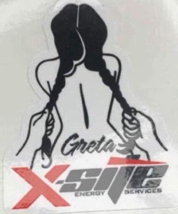 X-Site Energy Services’ logo bears the sticker that shows a silhouette of a woman marked ‘Greta.’ The company denied circulating the photo on social media but didn’t deny making the sticker.
