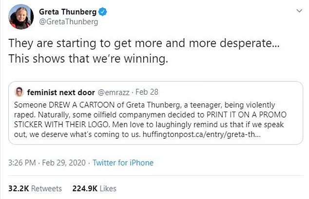 “They are starting to get more and more desperate… This shows that we’re winning,” Greta wrote.
