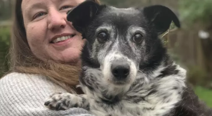 Despite being in twilight years, the pup enjoys mooching around in the garden, going for long walks in the woods, and playing with the chickens.