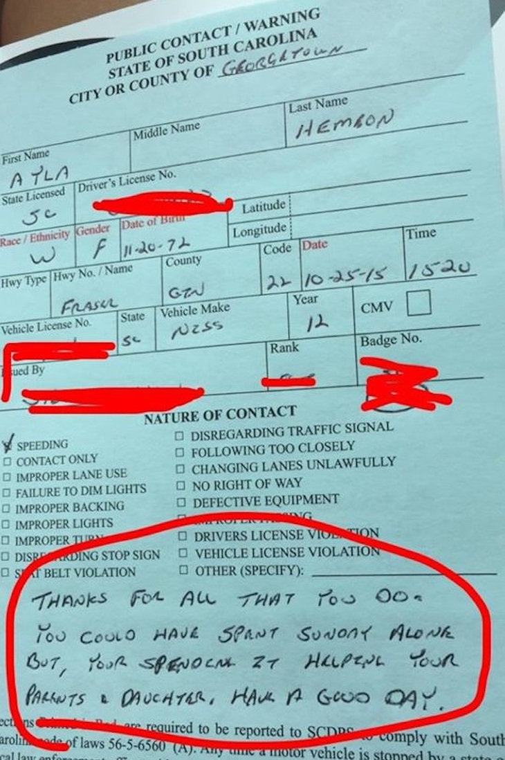 The officer had written, “Thanks for all that you do. You could have spent Sunday alone but you were spending it helping your parents and daughter. Have a good day.