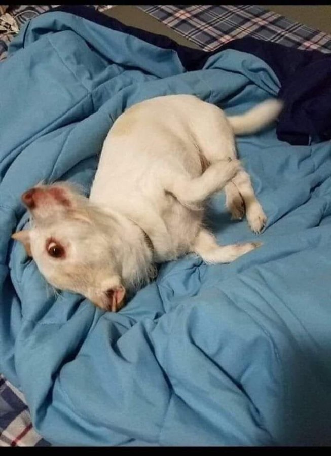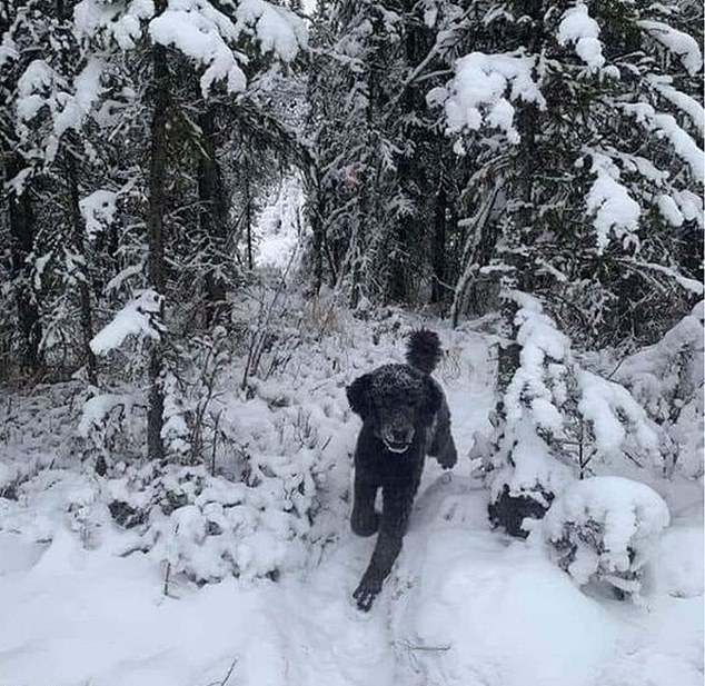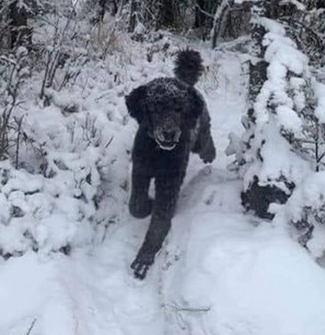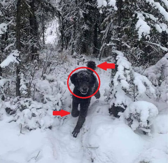 As some pointed out after taking a quick look at the photo, the dog’s head looks like a backpack covered in snow, whereas the poodle’s tail resembles a person’s head full of hair.
