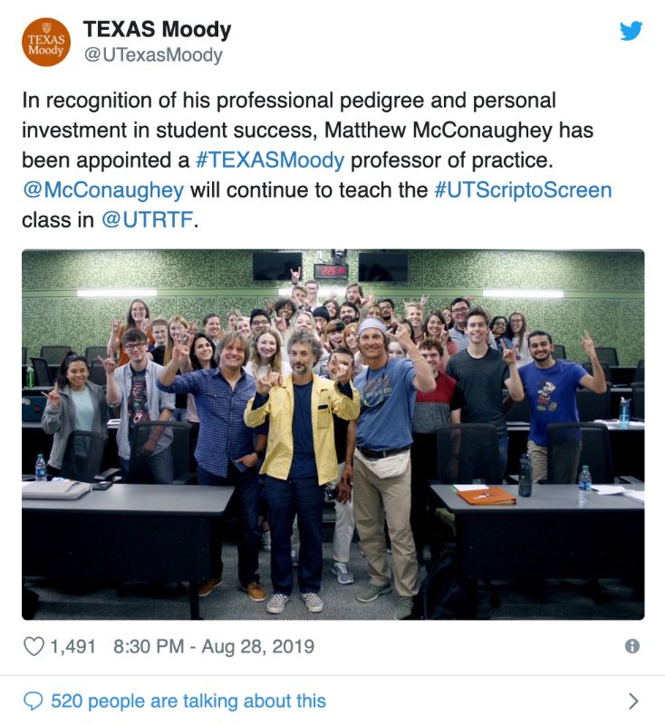 The Tweet read in recognition of his personal investment and professional pedigree in student success, McConaughey has been appointed a Texas Moody professor of practice, and that he will continue to teach the UT Script to Screen class in UTRTF.