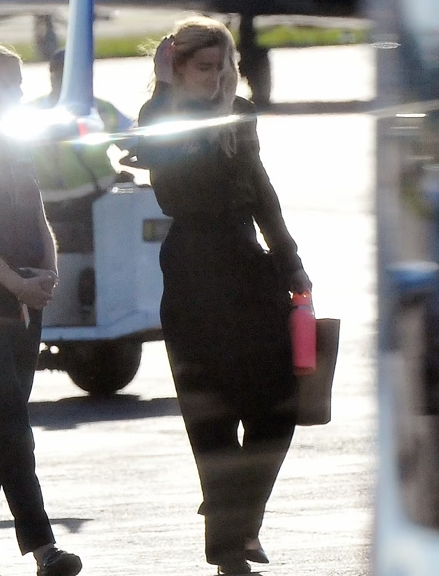 She carried a handbag and a bright orange bottle as she came out of the private jet alongside Whitney, who was by the actress’ side during the trial.