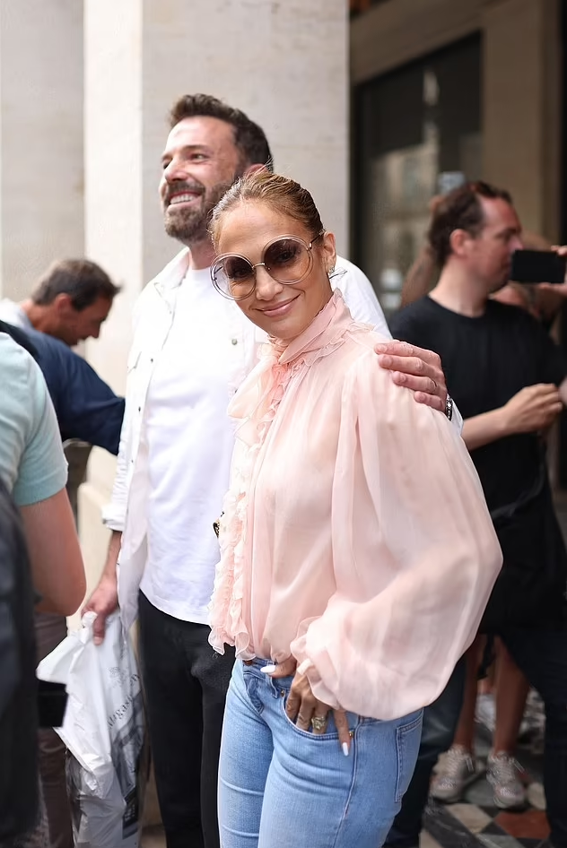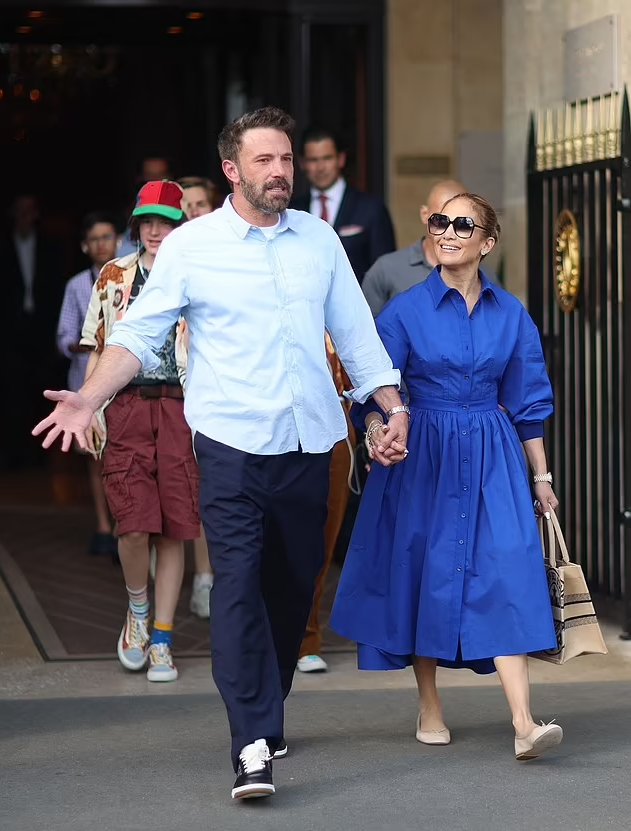 As they walked out of Hotel Crillon, JLo waved to onlookers while Ben was grinning from ear to ear.