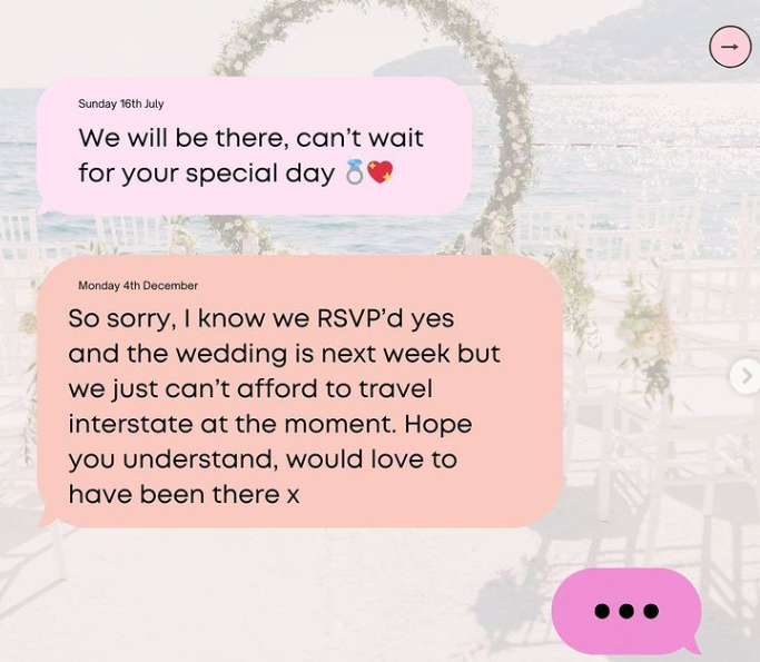The text message read: So sorry, I know we RSVP’d yes and the wedding is next week but we just can’t afford to travel interstate at the moment. Hope you understand, would love to have been there.”