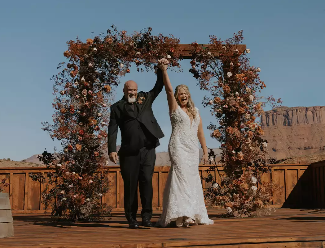 The couple, who first met on a dating app last year, exchanged their vows under a wooden arch that had flowers all over it.