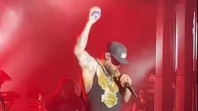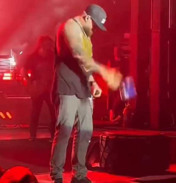 The clip, which was shared by Turning Point U.S.A. official Benny Johnson, shows the country music star picking up the can that somebody had thrown on stage. He then forcefully threw it onto the floor and caused it to explode.