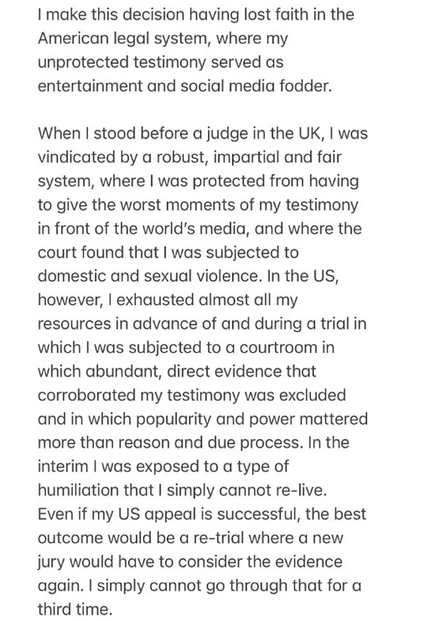 “I make this decision having lost faith in the American legal system, where my unprotected testimony served as entertainment and social media fodder,” she wrote.