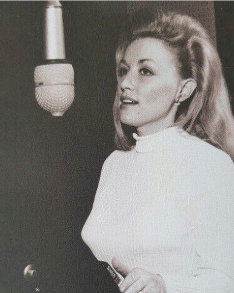 In the black and white photo, which was taken around 1965, she can be seen wearing a classic white sweater while in a recording booth after she signed to Monument Records.