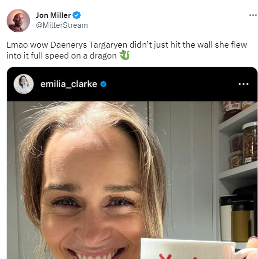 “Lmao wow Daenerys Targaryen didn’t just hit the wall she flew into it full speed on a dragon,” the Twitter user wrote.
