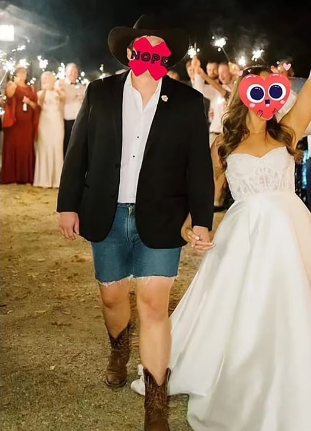 One baffled social media user suggested: “This must be a joke of some kind. I get the boots and hat but denim shorts? It’s supposed to be a wedding not a cowboy carnival!”