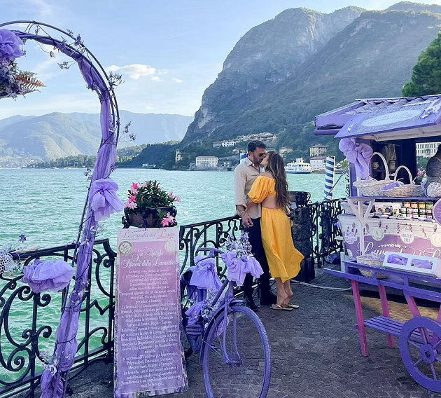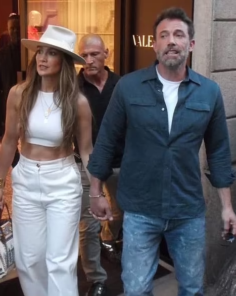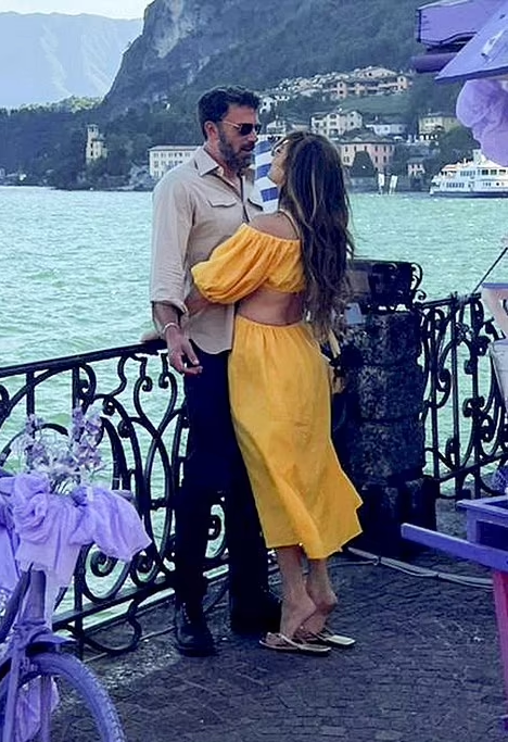 Jennifer and Ben stood near the Lavanda del Lago as they wrapped their arms around each other, with the singer wearing an off-the-shoulder crop top that showcased her curves and a matching long skirt.