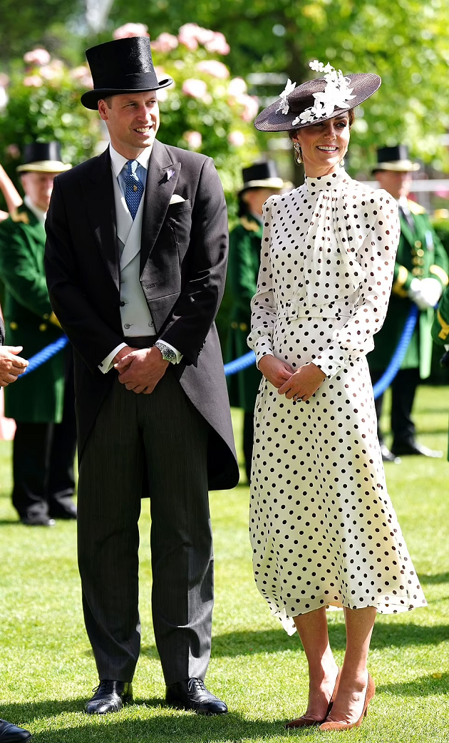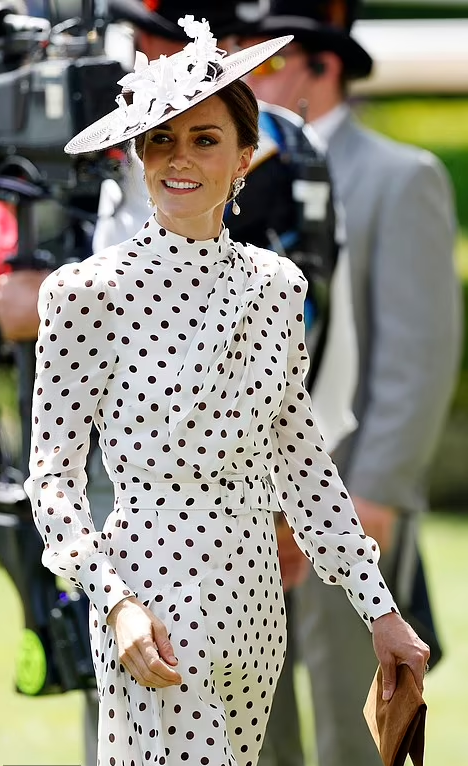 The mother-of-three also wore a Sally-Ann Provan black and white floral hat and Princess Diana’s pearl and diamond earrings as she arrived for day four of Royal Ascot.