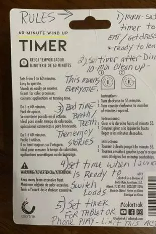 On the back of the timer, the mother-in-law had a suggested timetable to follow from morning to bedtime.