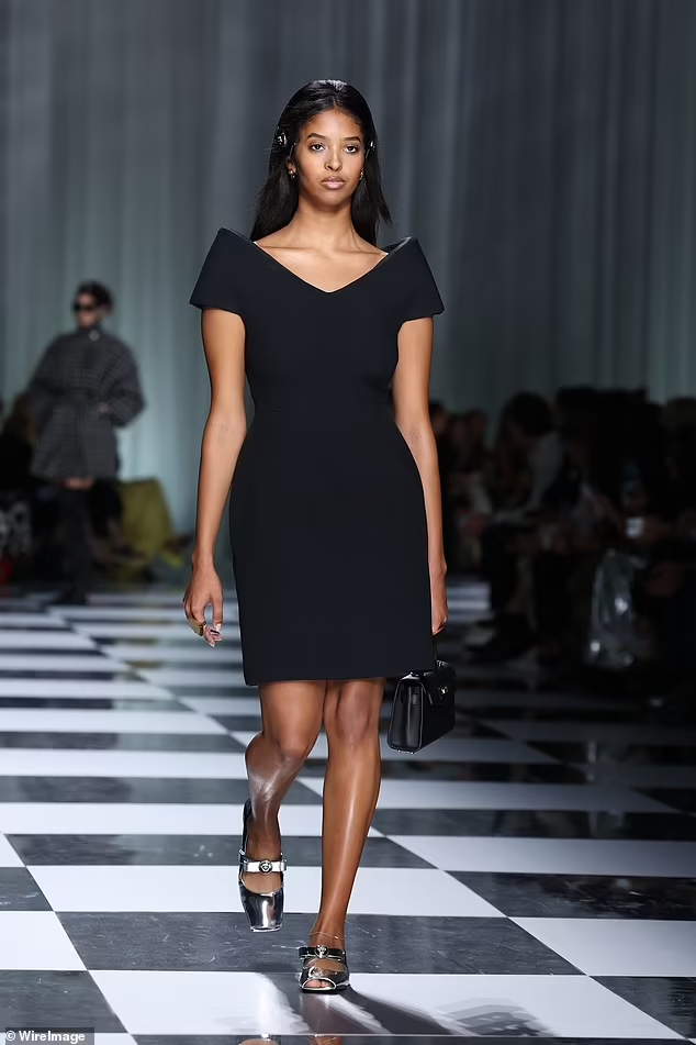 Her proud mother, Vanessa Bryant, was in the front row as she walked the Versace show sporting a black dress highlighting her long legs.