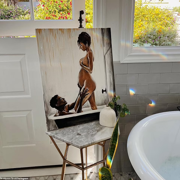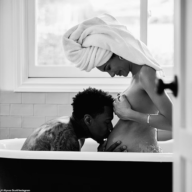 In their beautiful maternity photos, Alyssa can be seen standing in a bath tub with her hair up. She wore nothing but her bracelet and earrings and seemed to be stepping over Nick, who also appeared to be naked as he leaned against the edge of the tub.