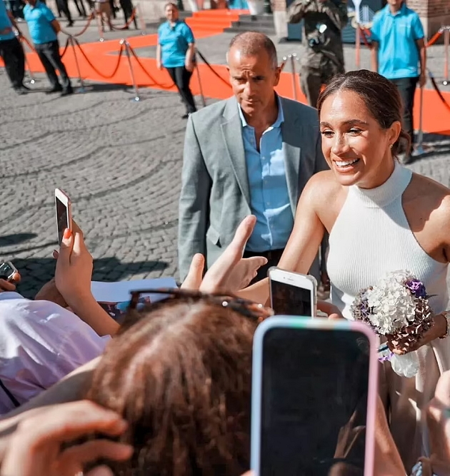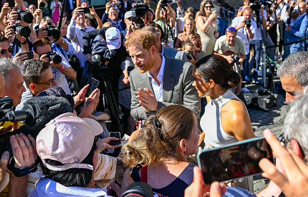 Hundreds of Brits and Germans waited for more than two hours in the heat hoping to take photos with the Duke and Duchess of Sussex at Dusseldorf town hall.