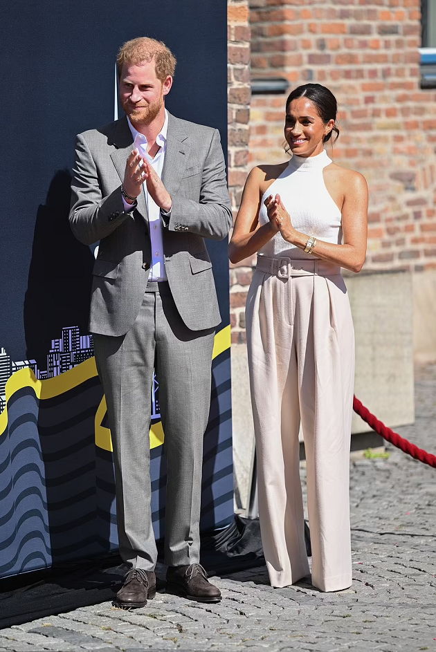 Meghan sported a cream knitted vest and matching trousers while Harry donned a grey suit when they flew into Germany where police set up roadblocks for their entourage.